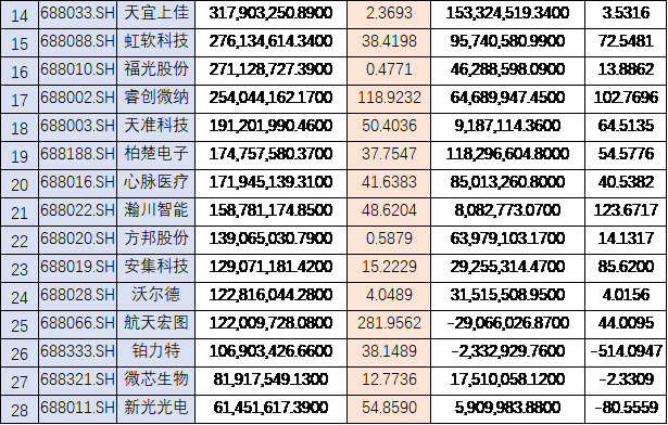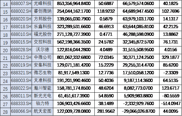 从归母净利润看,本次中报,科创板28家上市公司并非全部盈利,航天宏图、铂力特(688333)分别亏损0.29亿元和233.29万元。此外,还有3家公司盈利增速下滑,分别为新光光电、晶晨股份和微芯生物(688321)。