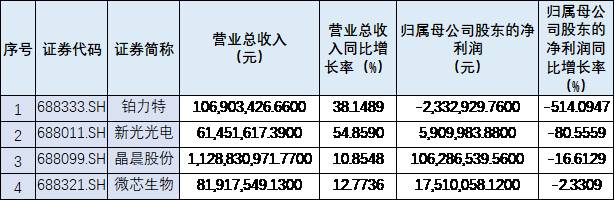 其中,铂力特归母净利润同比降幅最大,高达514.09%;新光光电位列其次,同比下降80.56%;晶晨股份归母净利润同比减少16.61%;微芯生物同比下降2.33%。