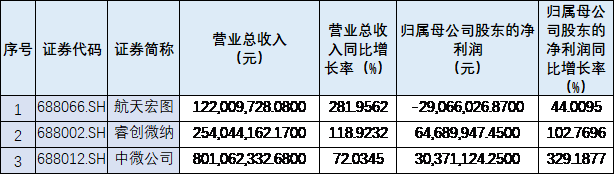 其中,航天宏图同比涨幅最大,达281.96%,实现营收1.22亿元;睿创微纳(688002)紧随其后,以118.92%的同比涨幅实现营收2.54亿元;中微公司较2018年同期上涨72.03%,营收8.01亿元,位列第三。