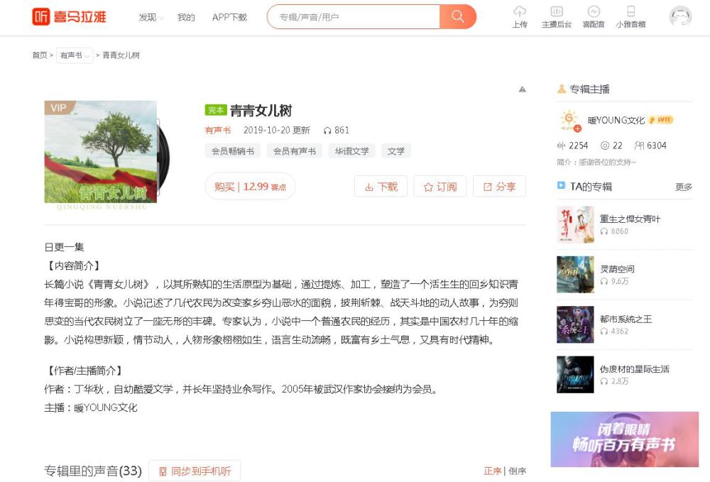 据悉,经作者授权同意,《青青女儿树》有声书由喜马拉雅独家制作,主播暖YOUNG文化倾情打造,每集制作20分钟5000字的有声书节目,在有声小说栏目面向全国听众开放。