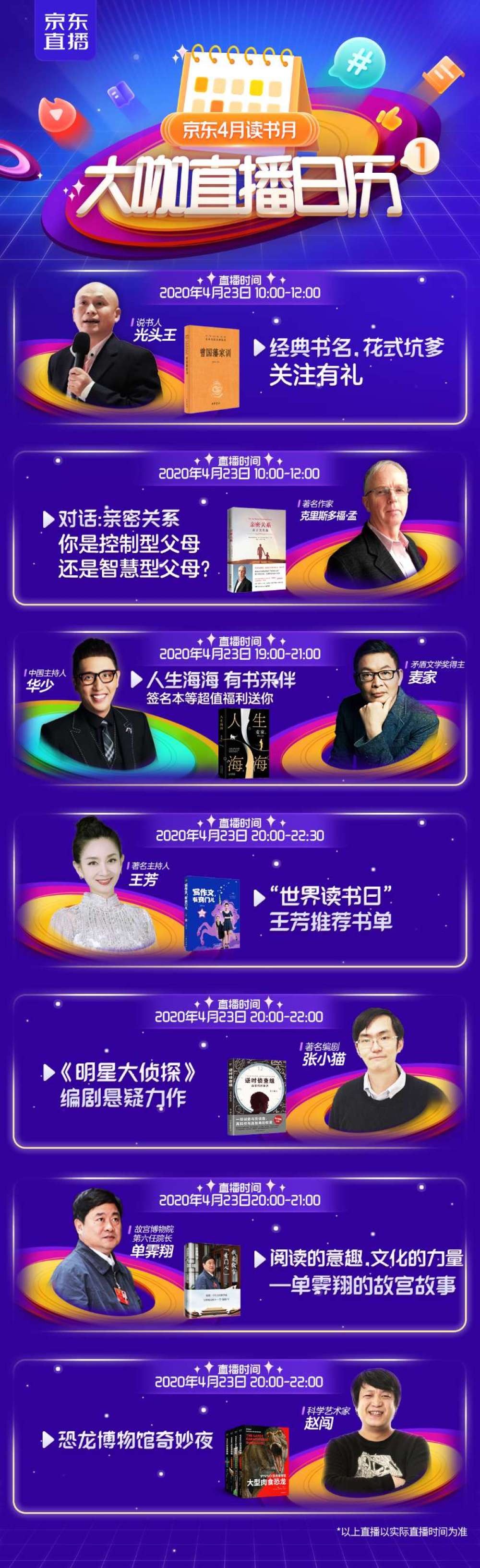 推广好书京东同样用心努力。京东图书在4月将推出1000多场直播活动。4月23日当天,京东直播间名家荟萃:作家麦家和主持人华少将出现在同一个直播间,聊聊人生,讲讲创作,谈谈读书。中国文物学会会长、故宫博物院第六任院长单霁翔在主题为“阅读的意趣,文化的力量”的京东直播中,携新作《我是故宫“看门人”》讲述“故宫那些事儿”。此外,著名主持人、第一训练营创始人王芳,中华书局新晋人气主播、外号“光头王”的王军老师,恐龙复原艺术家赵闯,“中国动物小说大王”沈石溪等名家都将在世界读书日当天为读者朋友带不间断的文化盛宴。