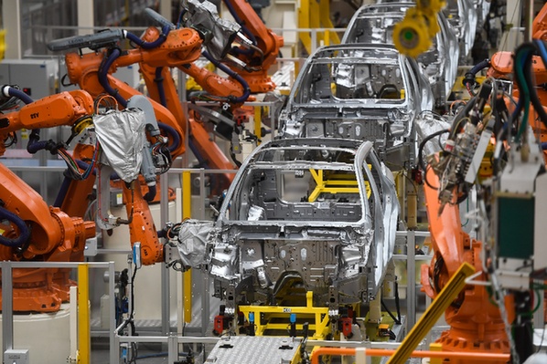 在浙江省宁波市北仑区吉利汽车春晓制造基地拍摄的自动化焊接线。记者 黄宗治 摄