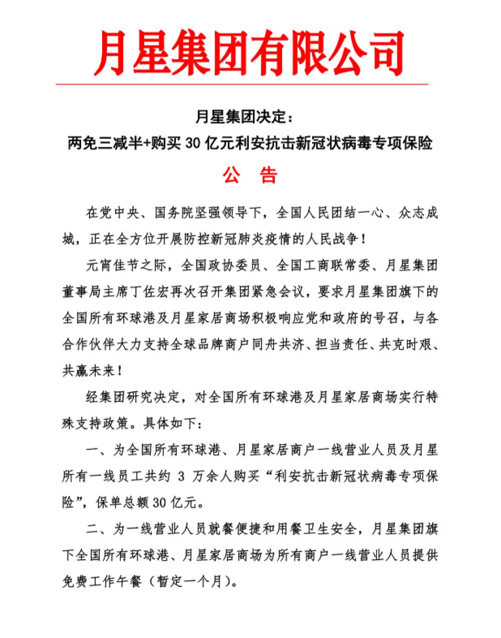 2月8日,国内大型实体商业企业——月星集团发布公告,对全国旗下环球港及月星家居商场实行特殊支持政策,包括免费提供新冠肺炎专项保障保险;商户相关费用减免并免费提供工作餐及口罩防护用品;为牺牲在抗疫一线人员的家属提供援助……据统计,多项政策叠加后,月星集团将为抗击疫情、促进行业发展提供数十亿援助支持。