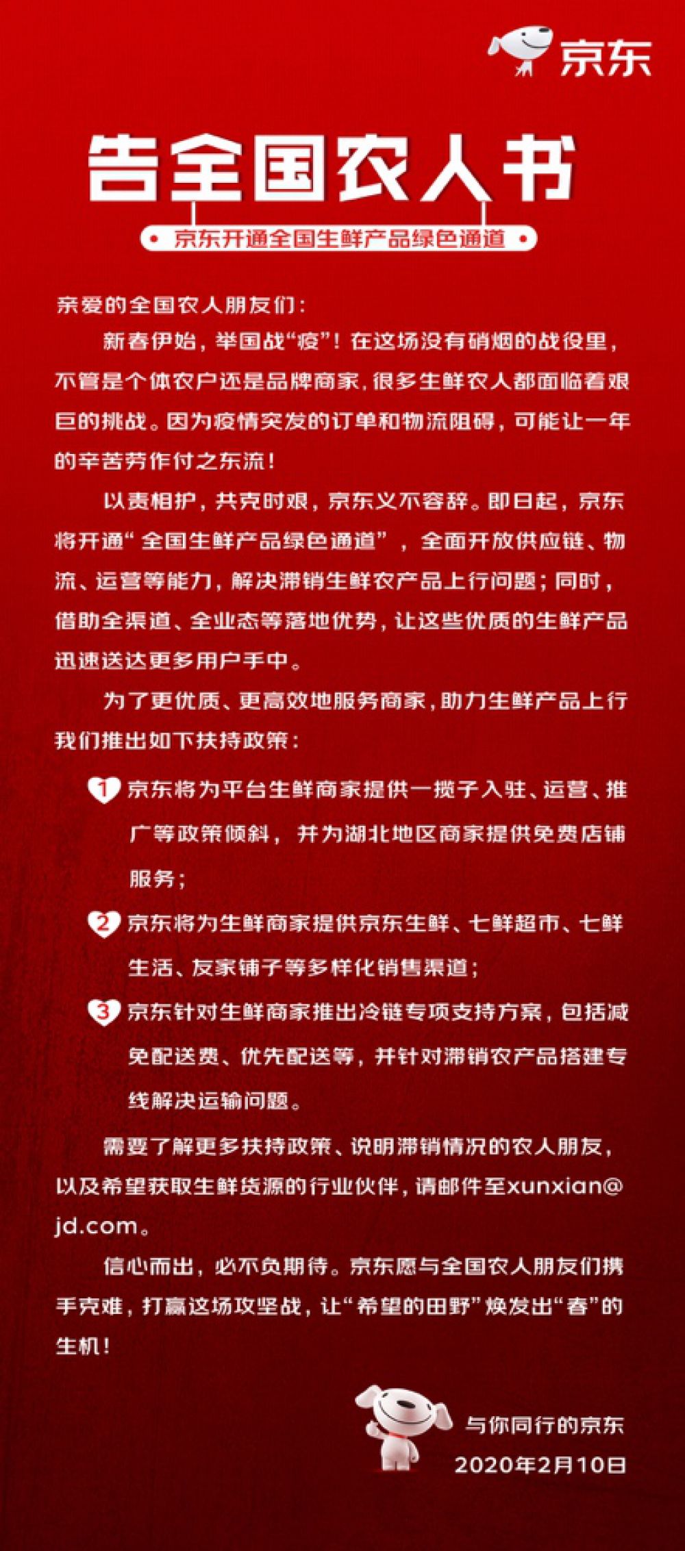 2月10日,京东发布“告全国农人书”,宣布开通“全国生鲜产品绿色通道”(下称“绿色通道”),全面开放并倾斜供应链、物流、运营、推广等核心资源,解决滞销生鲜农产品上行问题;同时,借助全渠道、全业态等落地优势,让这些优质的生鲜产品迅速送达更多用户手中。