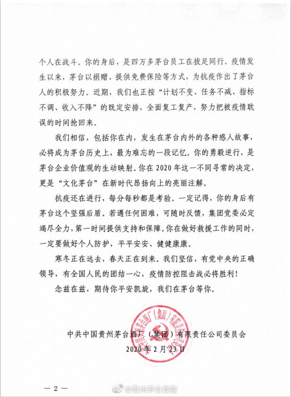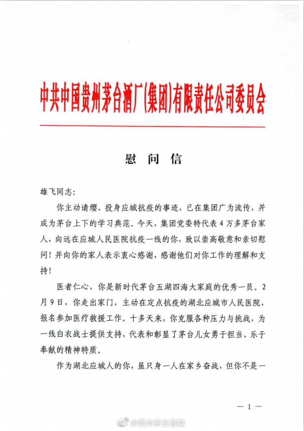 “作为湖北应城人的你,虽只身一人在家乡奋战,但你不是一个人在战斗,你的身后,是四万多茅台员工在拔足同行……”2月23日,茅台集团党委向远在湖北应城人民医院抗“疫”一线的茅台医院医生胡雄飞发去慰问信,向他表示诚挚的感谢和亲切的慰问,并向他的家人对他工作的理解和支持,表示衷心感谢。