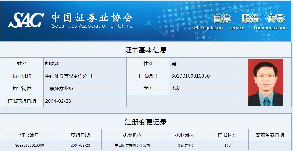 根据简历,胡映璐出生于1971年12月,硕士学历。现任中山证券有限责任公司总裁、投资银行管理总部总经理。曾任中山证券有限责任公司研究所副经理、办公室副主任(兼)、总裁秘书(兼)、投资银行部副总经理、总经理、投资银行总部副总经理、投资银行管理委员会副主任、资本市场部总经理、质量控制部总经理、投资银行事业部总经理、公司副总裁等职务。中证协官网信息显示,胡映璐早在2004年就加入了中山证券,至今已有15年时间,是不折不扣的老“中山人”。