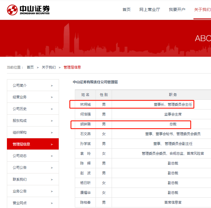 中山证券在7月31日的公告中透露,公司总裁变更事宜已于7月29日完成监管机构备案。原任总裁林炳城因个人原因辞任总裁,保留董事长、管理委员会主任、法定代表人职务;副总裁、投资银行事业部总经理胡映璐接任总裁一职。与此同时,中山证券官网显示的管理层信息也随之进行了更新。