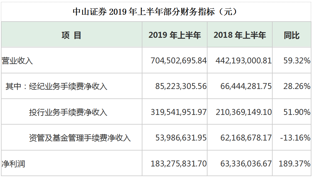 此前,作为公司控股股东,锦龙股份公布了中山证券2019年上半年未经审计财务数据。报告期内,中山证券共实现营收7.05亿元,相比于去年同期的4.42亿元,同比增长59.32%;与此同时,其上半年净利润为1.83亿元,对比去年同期的6333.60万元,同比大增189.37%。