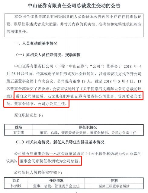 该变动已于2019年4月12日完成监管机构备案,4月16日完成工商登记变更。而此时距离林炳城就任中山证券总裁,仅过去了不到一年的时间。2018年5月4日,中山证券董事会审议同意石文燕辞去总裁一职,并同意聘请林炳城为公司总裁。公开信息显示,石文燕自2013年12月起担任中山证券董事、管理委员会委员、董事会秘书至今,2016年兼任总裁。