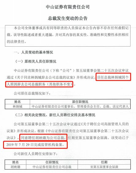 公告显示,2019年4月11日,中山证券董事会审议通过了《关于同意林炳城辞去公司总裁的议案》、《关于聘任公司高级管理人员的议案》两个议案。根据议案,原任总裁林炳城因个人原因辞去公司总裁职务,保留董事长、管理委员会主任、法定代表人职务;同意聘任胡映璐为公司总裁,任期至第五届董事会届满。该变动已于2019年7月29日完成监管机构备案。