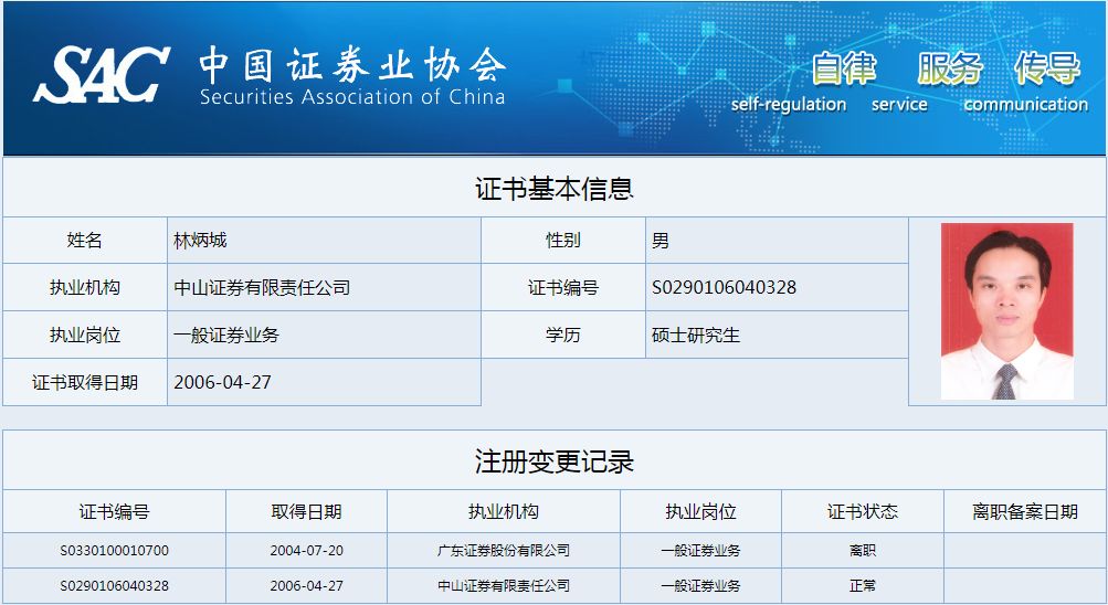 公开信息显示,林炳城是1973年7月生人,硕士学历。曾任职于广东证券,先后担任营业部副总经理、总经理、证券电子商务部负责人等职务。2006年4月加入中山证券,先后担任中山竹苑路证券营业部总经理、总裁助理、副总裁等职务;现任上海大陆期货有限公司董事,深圳锦弘和富投资管理有限公司董事长,中山证券有限责任公司董事长、管理委员会主任、法定代表人。