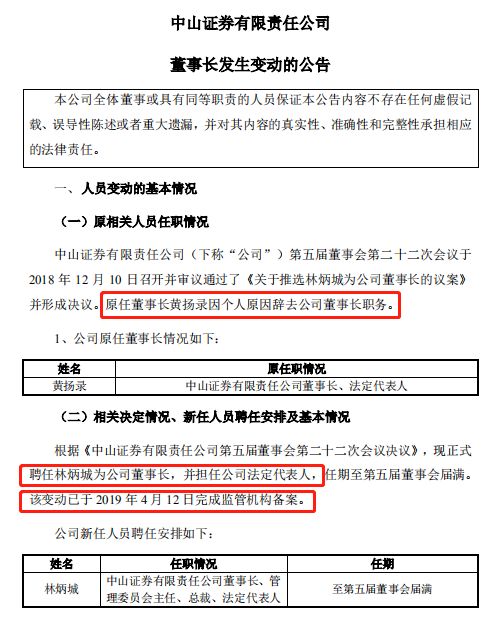 2019年4月16日,中山证券就董事长变动情况进行了公告披露。根据公告,中山证券董事会于2018年12月10日审议通过了《关于推选林炳城为公司董事长的议案》,原任董事长黄扬录因个人原因辞去公司董事长职务;正式聘任林炳城为公司董事长,并担任公司法定代表人,任期至第五届董事会届满。