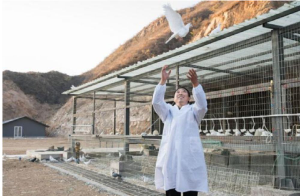 ↑阜平县京东“飞翔鸽”养殖场的工作人员正在放飞鸽子