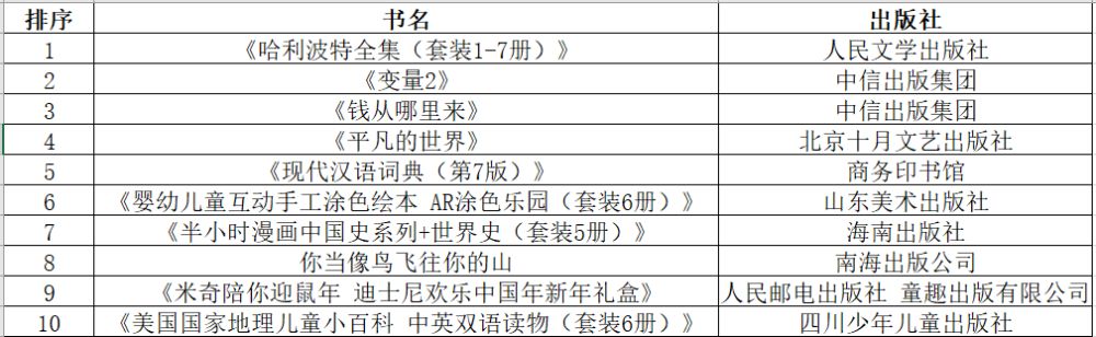 除此之外,罗振宇“罗胖”在“时间的朋友”跨年演讲中力荐的《变量2 》《钱从哪里来》两本书,以及《平凡的世界》《你当像鸟飞往你的山》等文学书籍销售排名靠前。在吃喝玩乐、走亲串友的难得假期里,为自己充充电也是不可或缺的功课。