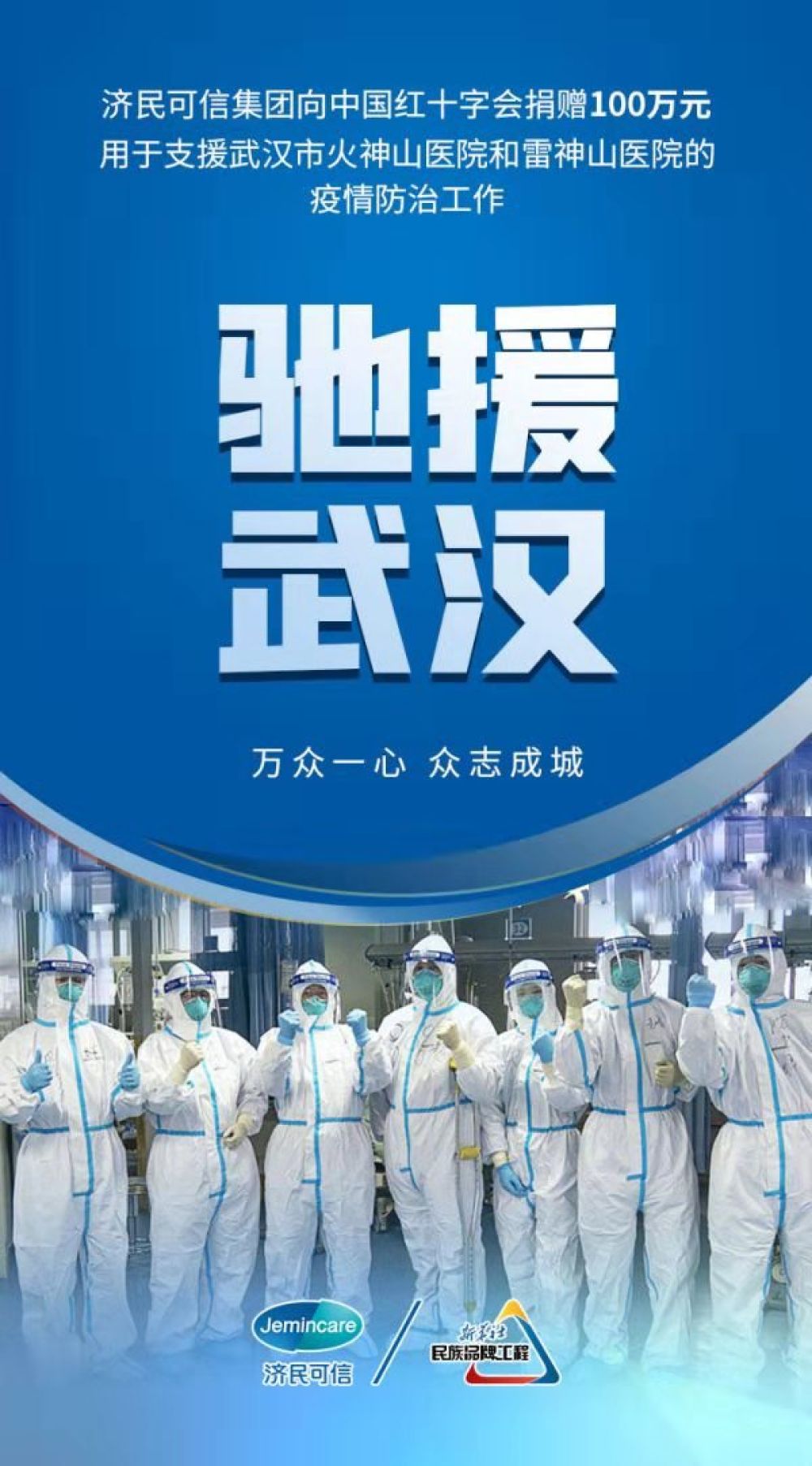 面对新型冠状病毒感染的肺炎疫情加快蔓延的严重形势,部分医疗机构出现的药品和防护物资短缺情况成为公众关心的焦点。2020年1月27日,新华社民族品牌工程入选企业——济民可信集团向中国红十字会总会捐赠100万元现金,专项用于支援武汉市火神山医院和雷神山医院的建设及疫情防治工作。