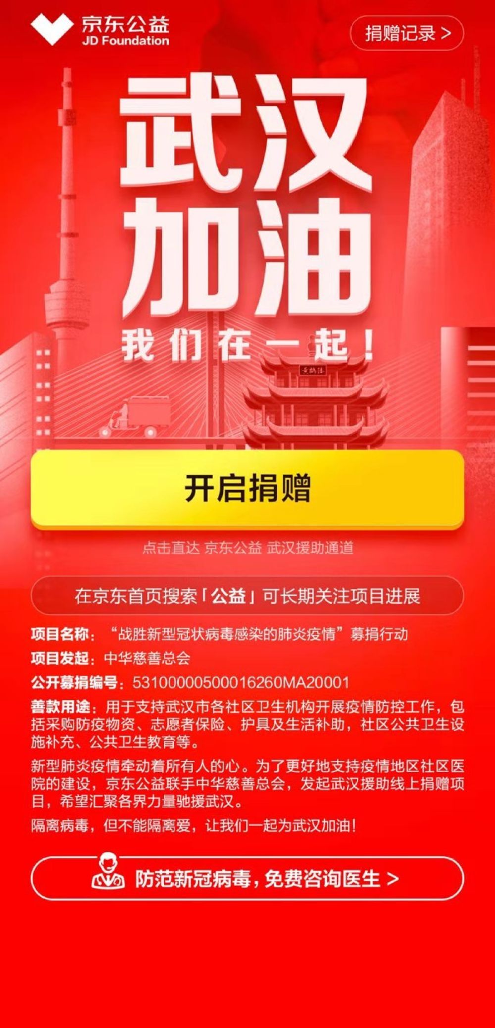京东与中华慈善总会联合在京东暖东公益平台上线“战胜新型冠状病毒感染的肺炎疫情”募捐行动,募捐款项将用于支持武汉市各社区卫生机构开展疫情防控工作,包括采购防疫物资、志愿者保险、护具及生活补助,社区公共卫生设施补充、公共卫生教育等。京东也成为中华慈善总会在此次疫情防控公益行动中的首家互联网合作伙伴。 京东与中华慈善总会在公益领域合作多年,作为中华慈善总会此次迎战疫情的首家互联网合作伙伴,京东快速推动项目筹备。京东零售、京东数科、京东物流多部门联动,第一时间上线募捐通道。募捐所得款项将用于采购医用外科口罩、防护服、防冲击眼罩、防护面罩、手术衣、护目镜等医疗物资,并快速送达医疗一线。