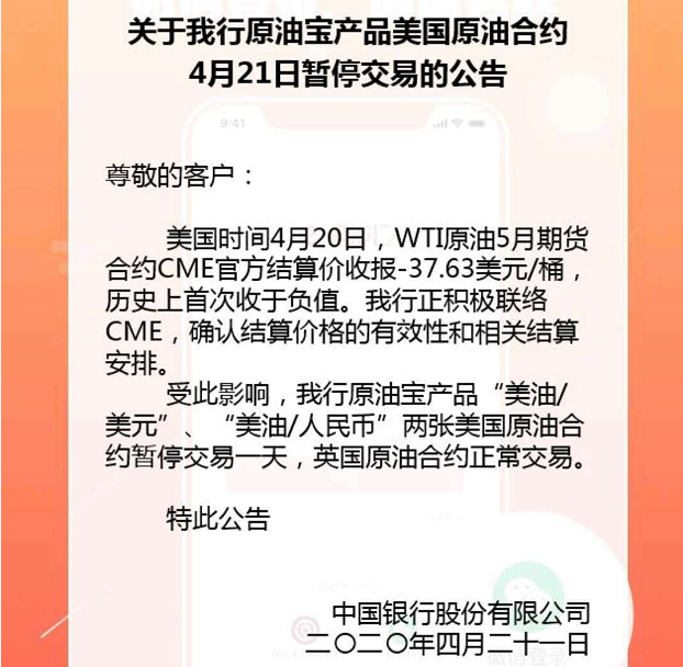 据悉,中国银行原油宝产品恰好在当晚自动转期,由于结算价格尚未确认,21日所有投资者的账户被冻结,处于浮亏状态。中行公告称,正积极联络CME(芝加哥商品交易所),确认结算价格的有效性和相关结算安排,暂停WTI原油合约当日交易。