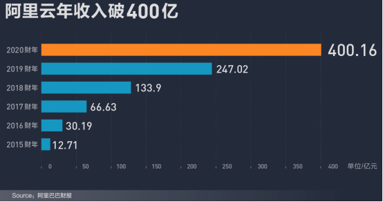 2020财年第四季度内,阿里云营收达122亿元,环比大幅增长,单季度收入连续第二个季度突破百亿元大关。对比历史数据,2015财年阿里巴巴首次披露云计算营收,当年阿里云收入为12.71亿元,到2020财年营收400亿元,6年间增长31倍。