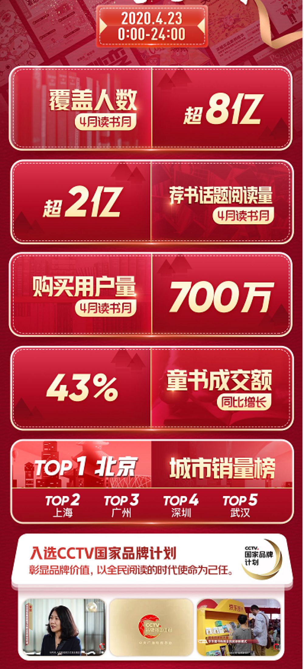 据统计,京东“4月读书月”活动覆盖人次超8亿,荐书话题阅读量超2亿,购买用户达700万。世界读书日当天,最受消费者欢迎的童书品类成交额同比增长43%。