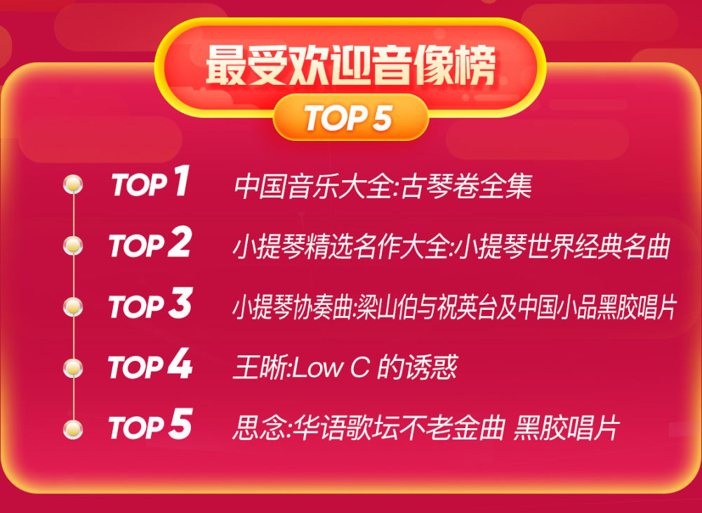 音像作品在本次图书特惠日上大放异彩。最受欢迎音像榜TOP5大部分被黑胶唱片与古典音乐承包,侧面显示出消费者对于黑胶唱片与古典音乐的需求与喜爱。由于黑胶唱片平均单价较高,在促销活动中也引发了消费者集中购买的热潮。