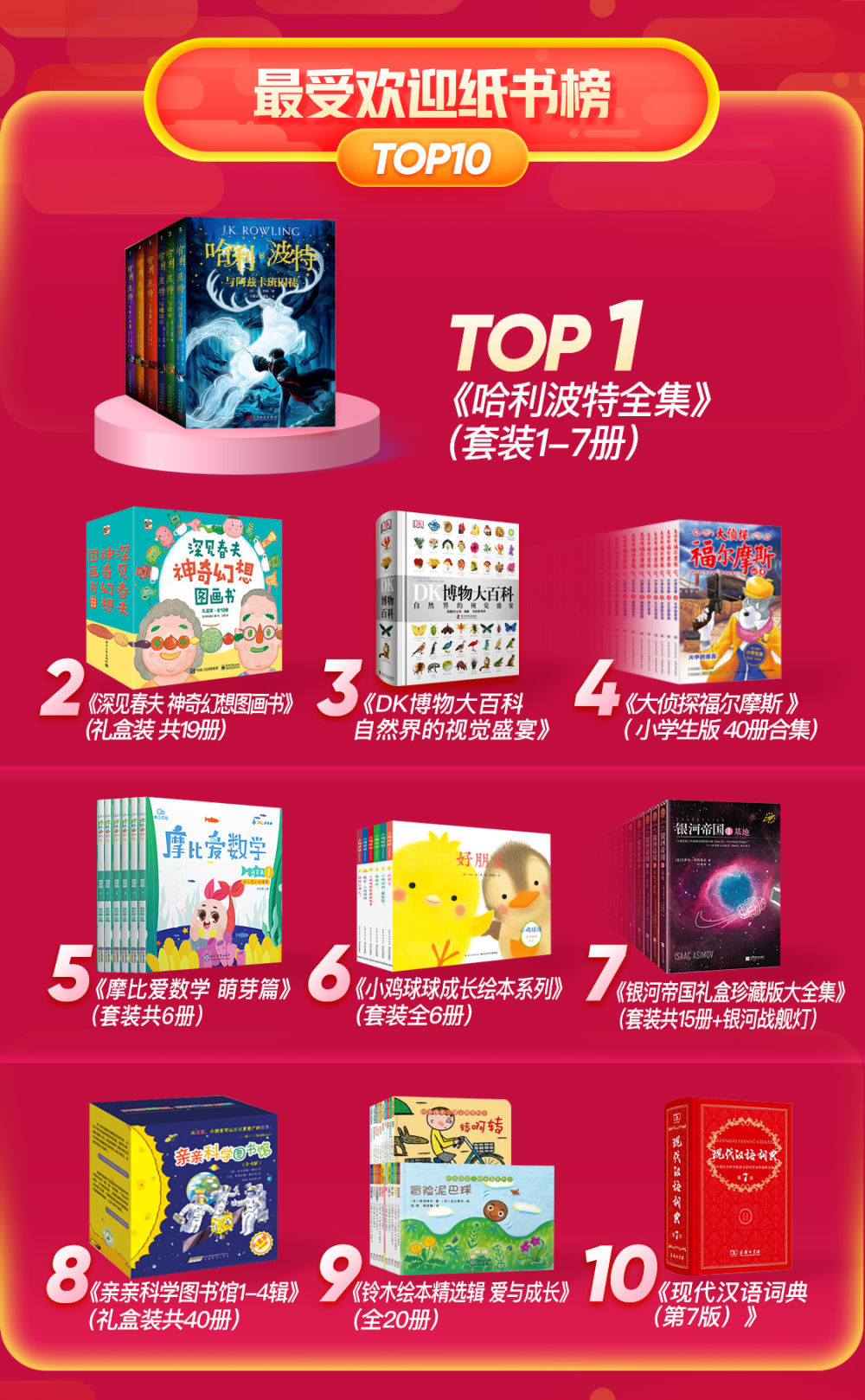 各热销榜单中,最受欢迎纸书榜TOP10 童书类占据7席,其中畅销多年的《哈利波特全集》占据榜首,排名第二的是日本荒诞儿童文学大师深见春夫的《神奇幻想图画书》礼盒装,本月刚刚面世就迅速上榜。第三名儿童科普书《DK博物大百科——自然界的视觉盛宴》一直在京东热销,商品评论条数近5万。值得一提的是,定位为培养3-6岁儿童思维启蒙的《摩比爱数学》系列图书,5月27日在京东销售同比增长30倍以上。