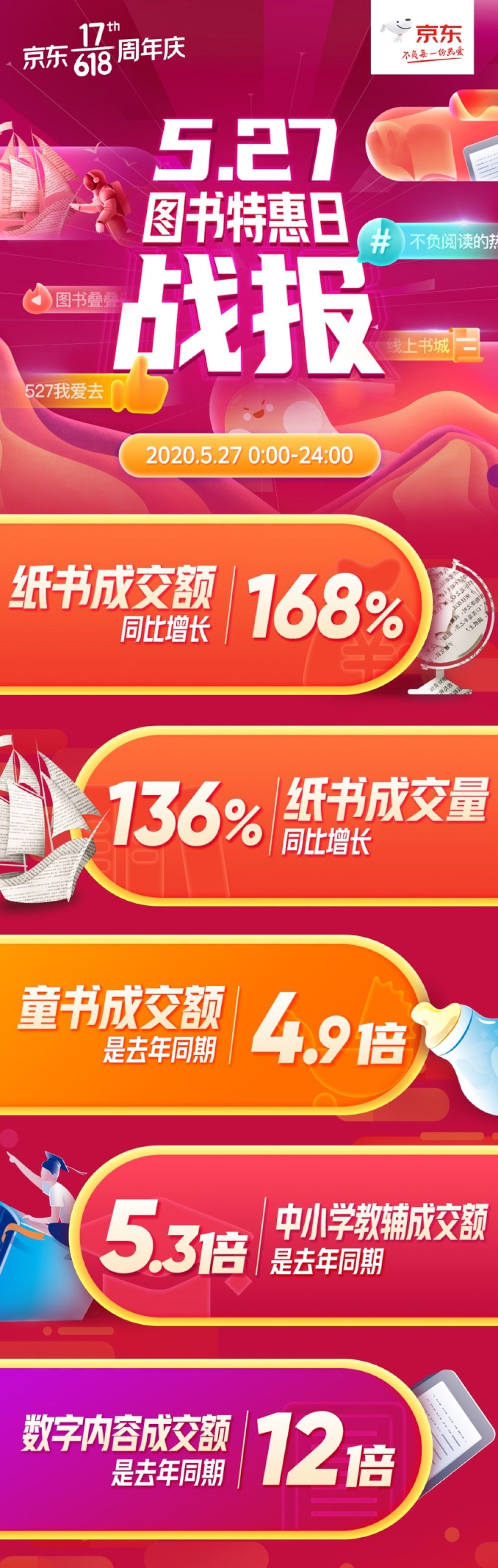 数据显示,在5月27日“图书特惠日”当日,纸书成交额同比增长168%,纸书成交量同比增长136%。其中,童书成交额是去年同期的4.9倍,中小学教辅成交额是去年同期的5.3倍。而数字内容成交额则达到去年同期的12倍。可见,历经疫情漫长的宅时光后,当人们有了更多的时间去读书,便重新爱上了读书。现阶段学生以网课为主的学习形式,使得中小学教辅用书销售持续走高。六一临近,更大大推动了童书的成交额。