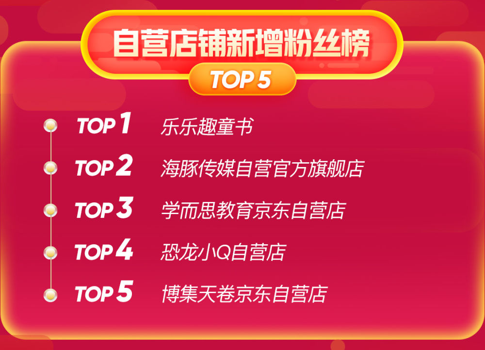 一直以来,自营业务都是京东的优势所在,本次图书特惠日,京东图书专门设计了自营店铺新增粉丝榜TOP5,乐乐趣童书、海豚传媒自营官方旗舰店、学而思教育京东自营店、恐龙小Q自营店和博集天卷京东自营店最终高调进榜。其中,海豚传媒自营官方旗舰店和博集天卷京东自营店的粉丝量已分别达到67.9万人和60.1万人,乐乐趣童书仅在5月27日当天就增加粉丝近10万。