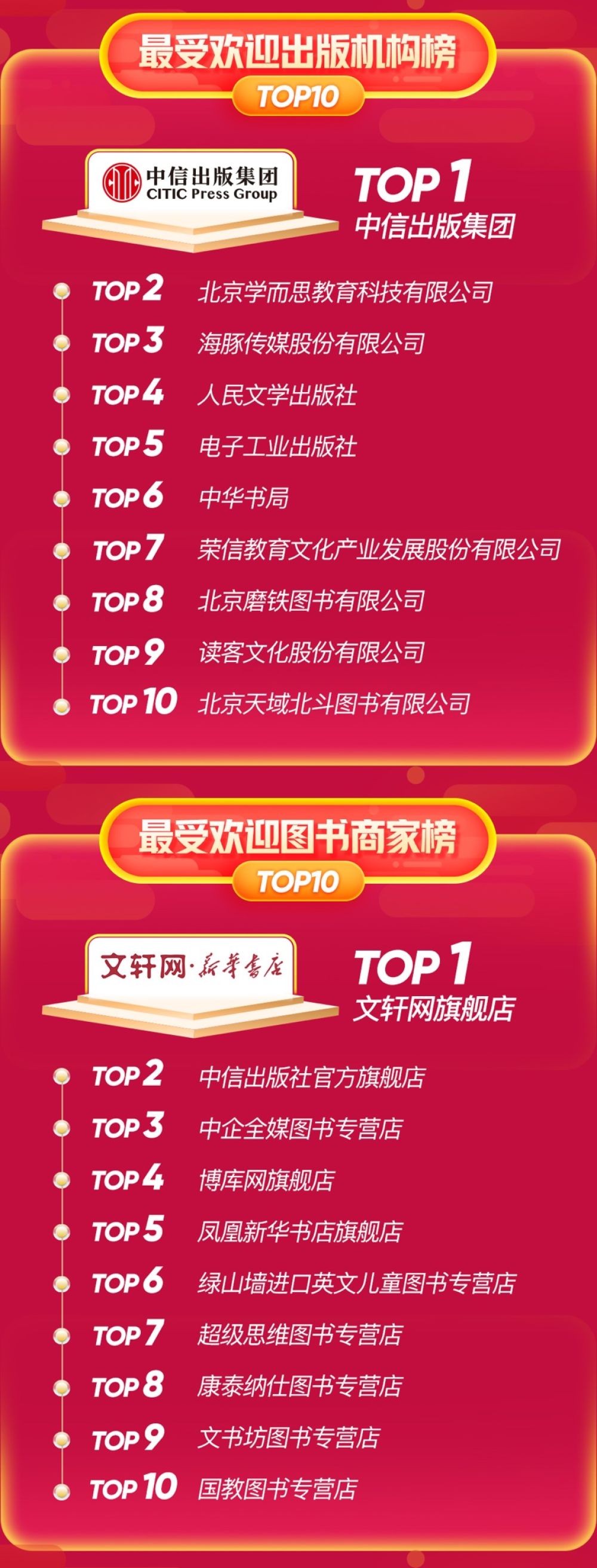 在最受欢迎出版机构榜TOP10中,中信出版集团、北京学而思教育科技有限公司、海豚传媒股份有限公司名列前茅,足以见证读者对知名机构的认可与信赖,最受欢迎图书商家榜TOP10的前三甲,则分别被文轩网旗舰店、中信出版社官方旗舰店、中企全媒图书专营店三家收入囊中,丰富的图书品类、多元化的营销形式和完善的售后服务,是它们赢得消费者喜爱的关键所在。
