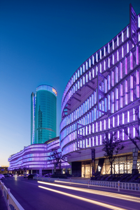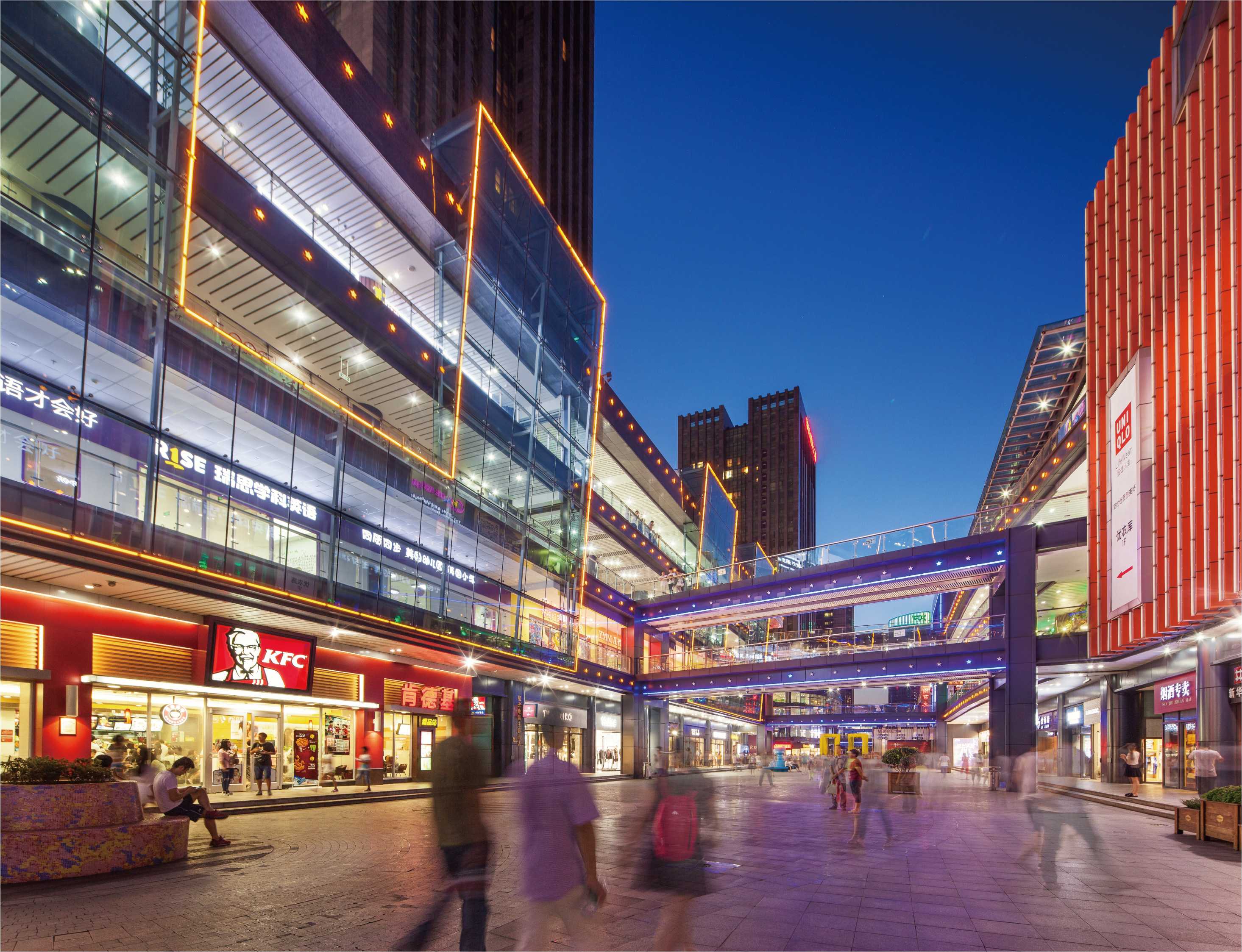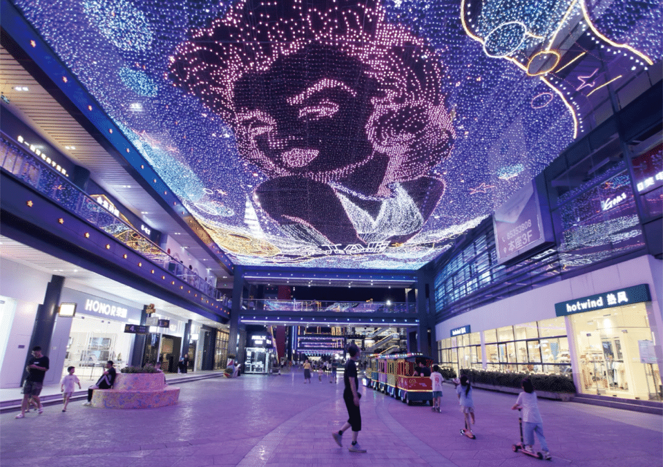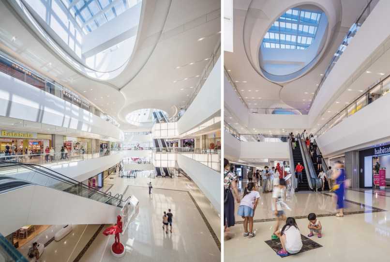 漫步在星光大道的建筑群落间,你感受到的不仅仅是建筑本身,还有绚烂的彩色灯光,通过现代材料和流线设计,建筑犹如电影胶片漂浮在半空之中,裙房的玻璃幕墙,犹如流动的影片;而在商场内部闲逛的间隙,偶尔抬头望见的那扇天窗,则会让你想起电影的摄像头,仿佛走进梦幻的时空隧道。