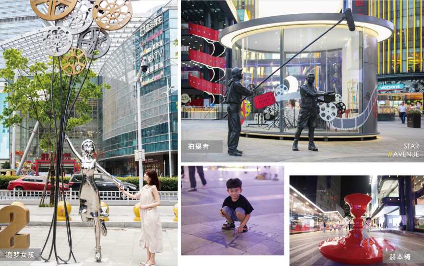 街区内,应用在路面地砖上的明星手模,游客可以在这里亲密接触文化艺术人物的印记;北入口“追梦女孩”的雕塑,手持胶盘气球造型;而艺术品“陀螺”,表达的则是“盗梦空间”中判定梦境和现实的重要道具中,是游玩拍照的最佳道具;在街区闲逛时还能偶遇“赫本椅”, 360度欣赏赫本的完美侧脸;另外,“星创空间”、“星芒雕塑”、“拍摄者”铜雕等,都会让我们邂逅别样的电影情怀。