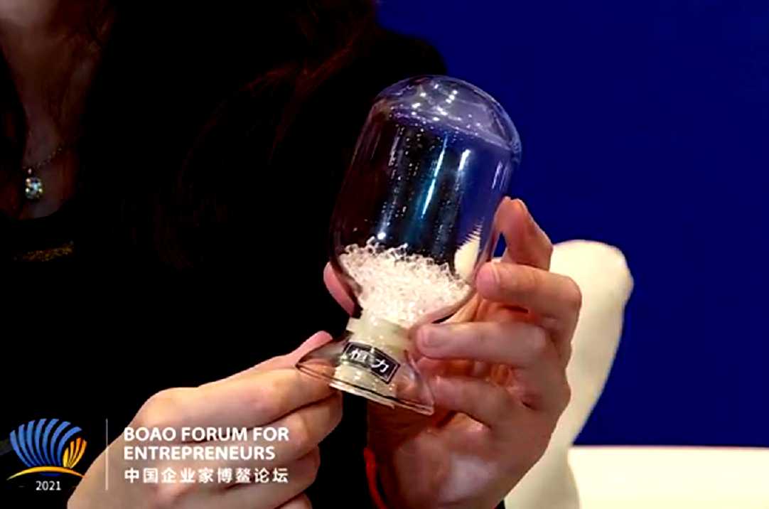 “这个白色结晶粉末就是新日恒力的核心产品(长碳链二元酸),看起来晶莹剔透,像水晶一样。”黄海粟现场展示了样品。