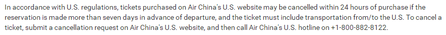 据中国国航美国官网显示,凡是在飞机起飞至少七天前,在中国国航美国官网购买的机票,由美国出发或者终点为美国的机票,都可以在24小时内取消。