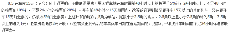根据《铁路互联网购票须知》,开车前15天(不含)以上退票的,不收取退票费;票面乘车站开车时间前48小时以上的按票价5%计,24小时以上、不足48小时的按票价10%计,不足24小时的按票价20%计。