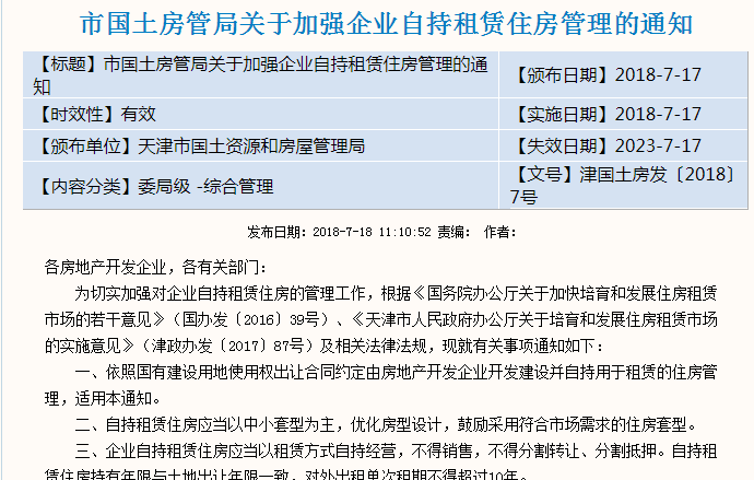 7月18日,天津市国土资源和房屋管理局发布《关于加强企业自持租赁住房管理的通知》。