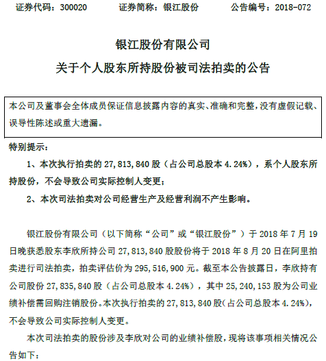 银江股份20日早间发布公告称,公司于7月19日晚获悉,股东李欣所持公司2781.38万股股份将于2018年8月20日在阿里拍卖进行司法拍卖,拍卖评估价约为2.96亿元。