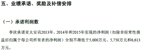 同时,亚太安讯实控人李欣承诺,亚太安讯2013年-2015年实现扣非后净利润分别不得低于5000万元、5750万元和6613万元。