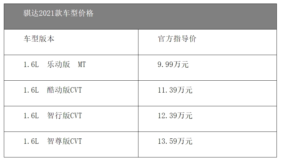 2021款骐达在宽适空间、安全科技、超低油耗等传统优势之上,融合双色潮流设计及全新智联科技,以更全面的产品实力,重新定义两厢车市场新模范。此次,2021款骐达共推出4款车型,官方指导价格9.99万元-13.59万元。