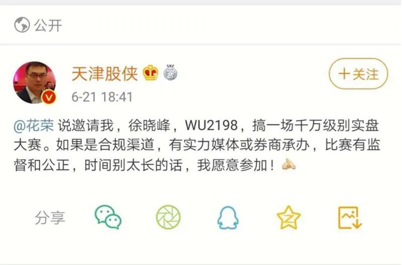 对于挑战邀请,“天津股侠”称,如果是合规渠道,有实力券商承办,比赛有监督和公正,时间长短合适的话,愿意参加。他还发微博表示:“需要验资的话,今晚我就可以晒出来符合资金要求的账户。”