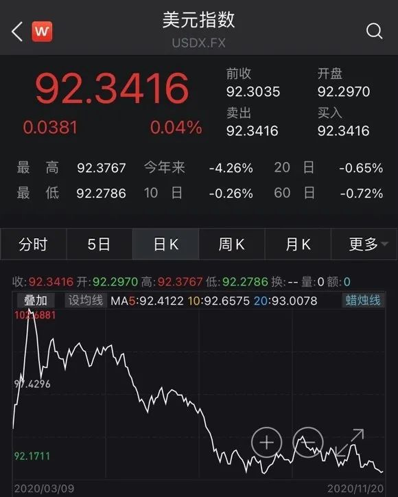 事实上,美元指数在低位窄幅震荡已有多时。截至11月19日,美元指数已经连续第六个交易日下跌。而自3月高点以来,美元指数已跌去逾11%。