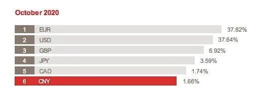 具体看,10月份,欧元、美元、英镑和日元分别以37.82%、37.64%、6.92%和3.59%的占比位居前四位。