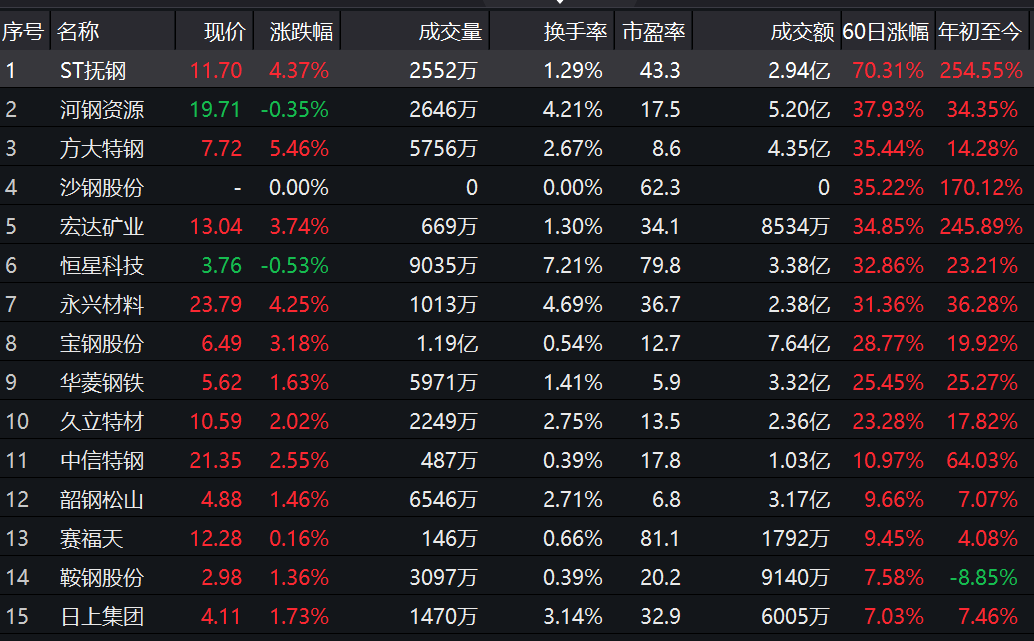Wind数据显示,11月以来,钢铁指数(886012)月内涨幅达到15.45%。其中,ST抚钢、河钢资源、方大特钢、沙钢股份等7家钢铁类上市公司近60日涨幅超过30%。