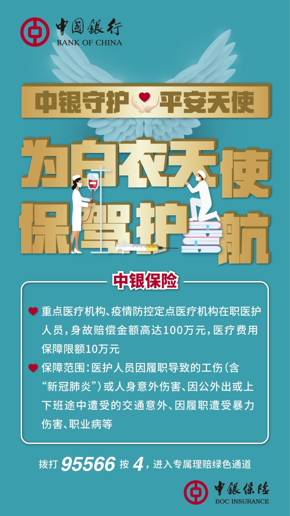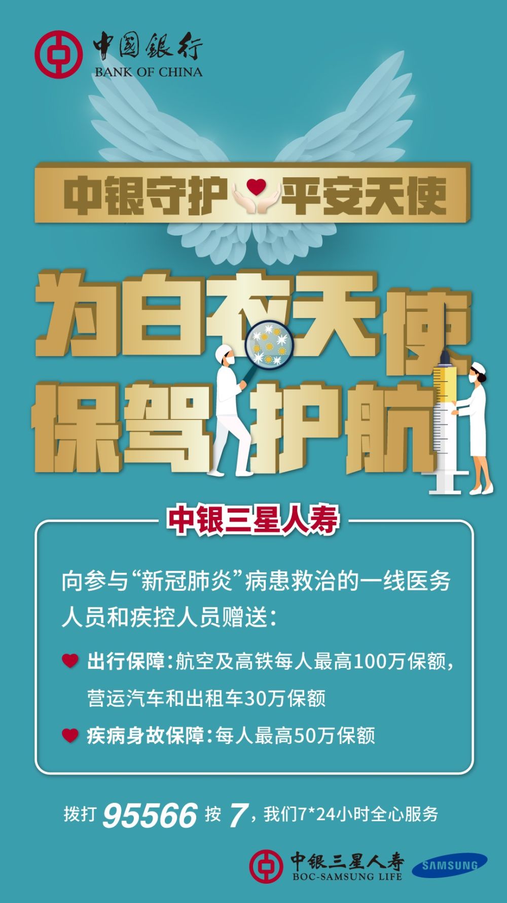 中国银行携旗下中银保险、中银三星人寿两家保险公司推出“中银守护·平安天使”抗击疫情活动,向全国疫情防控重点地区的500多家医疗机构赠送保险12万份,为在疫情防控一线的医务工作者提供保险保障。
