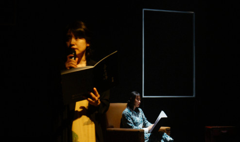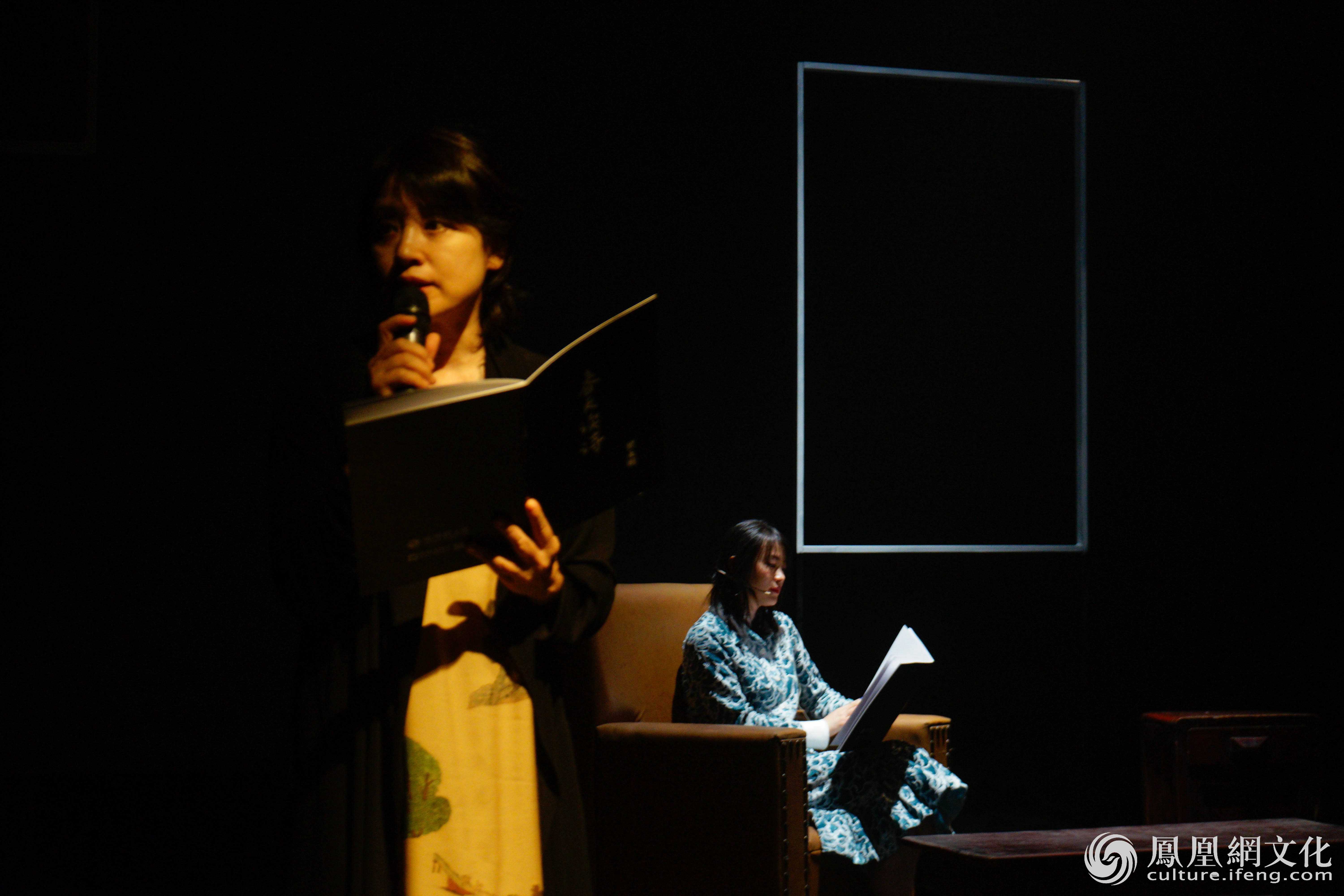 而在“春天读诗之夜”的现场,《十四首素歌:致母亲》(节选)以新的形式原景重现,大屏幕的影像里黄璐一袭花裙,在荒草中奔寻,回眸,望向镜头之外。随后黄璐从影像中走出,出现在现实的舞台上,她倚靠沙发,头顶只有一束静谧的高光,背后是空无一物的窗框,口中念着诗句“多年来我不断失眠/我的失眠总围绕一个轴点:/我凝视母亲”。接着翟永明出现,两人一前一后念诵同样的诗句。翟永明的声音深沉而温柔,“在那些战争年代我的母亲/每天在生的瞬间和死的瞬间中/穿行”。