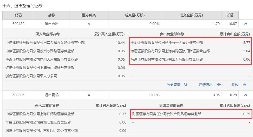 盘后的龙虎榜数据显示,退市吉恩的成交中,平安证券长沙五一大道营业部、海通证券上海普陀区澳门路营业部、海通证券双鸭山五马路营业部3家营业部席位成功出逃,3家席位的合计成交金额为10.87万元,刚好等于退市吉恩全天成交金额。