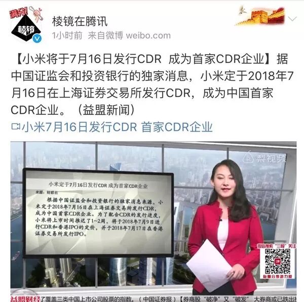 这张截于6月1日的微博截图显示,这条【小米将于7月16日发行CDR 成为首家CDR企业】的“新闻”,已经由棱镜在腾讯官微援引益盟新闻援引财联社。继续寻根溯源的话,这条“新闻”则是由财联社于5月31日援引36氪,而36氪则在自己的APP上标注自己援引自一个名为IPOXXX(XXX为手动马赛克)的微信公众号。