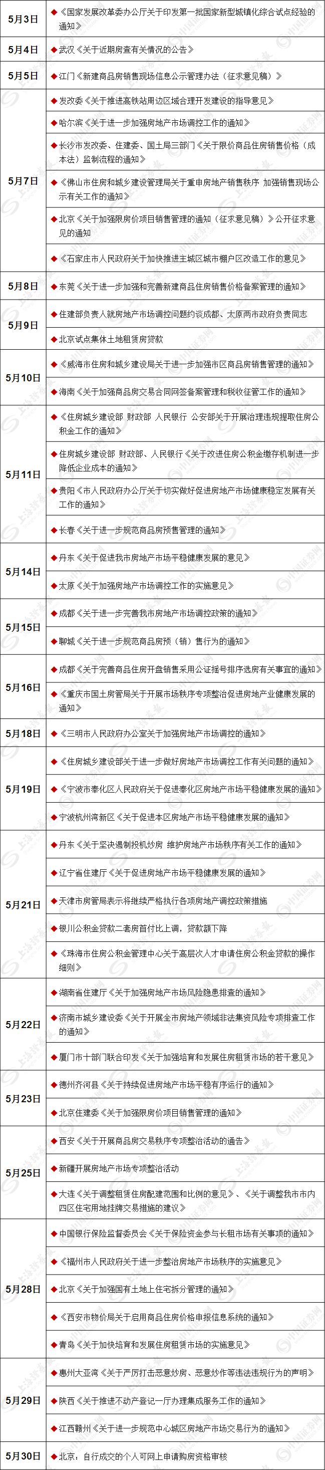 中原地产研究中心统计数据显示,刚刚过去的5月份,全国有超过40个城市发布调控政策多达50次,创出单月调控次数最多的纪录。同时,今年前5个月调控政策出台总次数同比增长约六成。