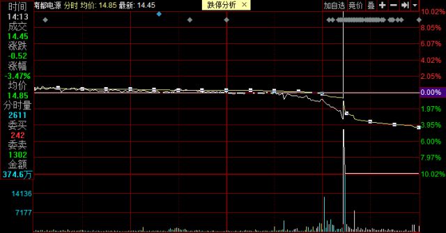 那边厢,南都电源也“懵圈”了。同样在14时13分,合计7165手跌停价挂单的卖单将南都电源砸向跌停板,成交金额不过965.2万元。随后跟风的卖单,一直将股价锁定在跌停板上。当日,南都电源成交金额2.25亿元,较平日有所放大。