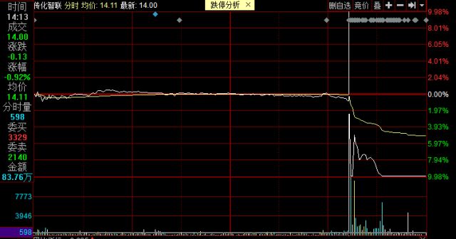 情况来得突如其来。复盘可见,14日下午开盘后,传化智联股价微跌,跌幅不到1%。但14时13分,共计7087手的卖单以12.72元/股的跌停价挂单,一下子将传化智联打到跌停板上,成交金额不过901.5万元。此后,买盘曾一度撬开跌停板,但最终仍未能打开跌停。