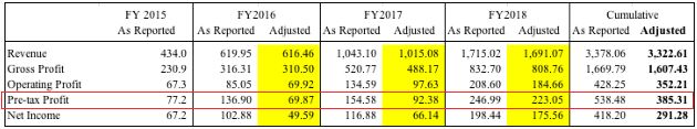 3、2016-2018财年期间净利润率为8.8%而非公告的12.4%,其中2018财年的净利润率为10.4%而非11.6%。