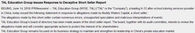 北京时间14日下午,好未来回应浑水做空报告称,报告中存在大量错误、无依据的猜测以及恶意解读。董事会与审核委员会将对指控进行评估,并考虑采取适当手段保护公司股东利益。